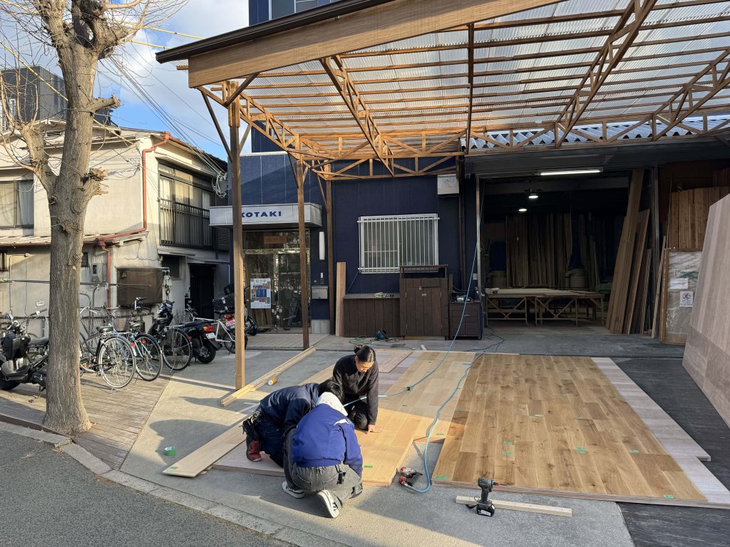 サイズが大きく、外のほうがフローリング目地を合わせやすいので屋外作業です。